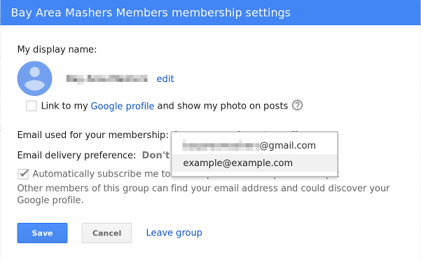 This means you’re already in the Google Group but you’ve configured an alternate email address with Google and have configured Google Groups to use that email address in this Group. To confirm that this is the case, browse to the Google Group, for example https://groups.google.com/forum/#!forum/bam-members. If you see You must be a member of this group to view and participate in it. Membership is by invitation only, you are likely logged into Google with a different Google account than the one that has the customized email address, try logging in to the right Google account. If instead you see a bunch of posts by BAM members, this indicates you’re logged into Google with the right account and have access to the group. Click on the button with the person and the gear icon in the upper right called “My Settings”, then click on “Membership and Email Settings”